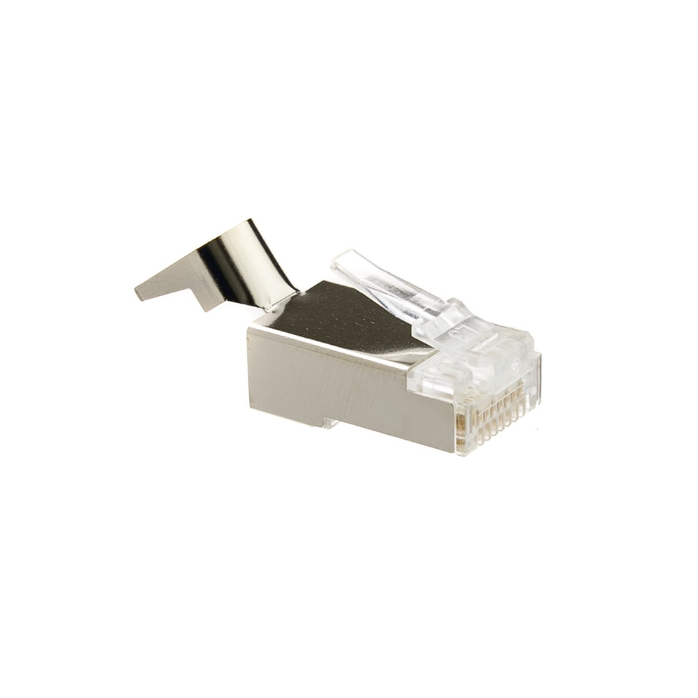 RJ45 Connector STEEL Shielded Plug CAT5 RJ-45 Lan Connector Clear plastic housing with gold-plated contacts for fast and accurate data transmission. Long-lasting flexible lock pins allow for more Plug-Unplug cycles. Cable insert and high strength strain relief boot for added durability. RJ45 Shielded Plug Cat5 8P8C Lan Connector Network.